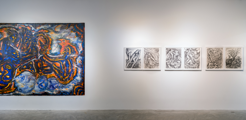 Coming from a region beset by war, Kanso found himself a foreigner in America during a tumultuous period in the country’s socio-cultural and political restructuring. In 1968, while completing his BA and MA at NYU, Kanso set up his studio in Manhattan amid a climate of unprecedented protest against America's military intervention in Vietnam. Kanso’s large, unstretched paintings bring to life a powerful and confrontational cluster of human-sized figures–leaping and floating–reaching outward to a world in a state of complete disintegration. He did not intend for his paintings to recount specific historical events, but rather to serve as a manifestation of emotions, and tragedies associated with global conflicts. His paintings unearth a unique visual iconography which weave together elements of neo-expressionism with mythological imagery, citing both contemporary and classical sources.